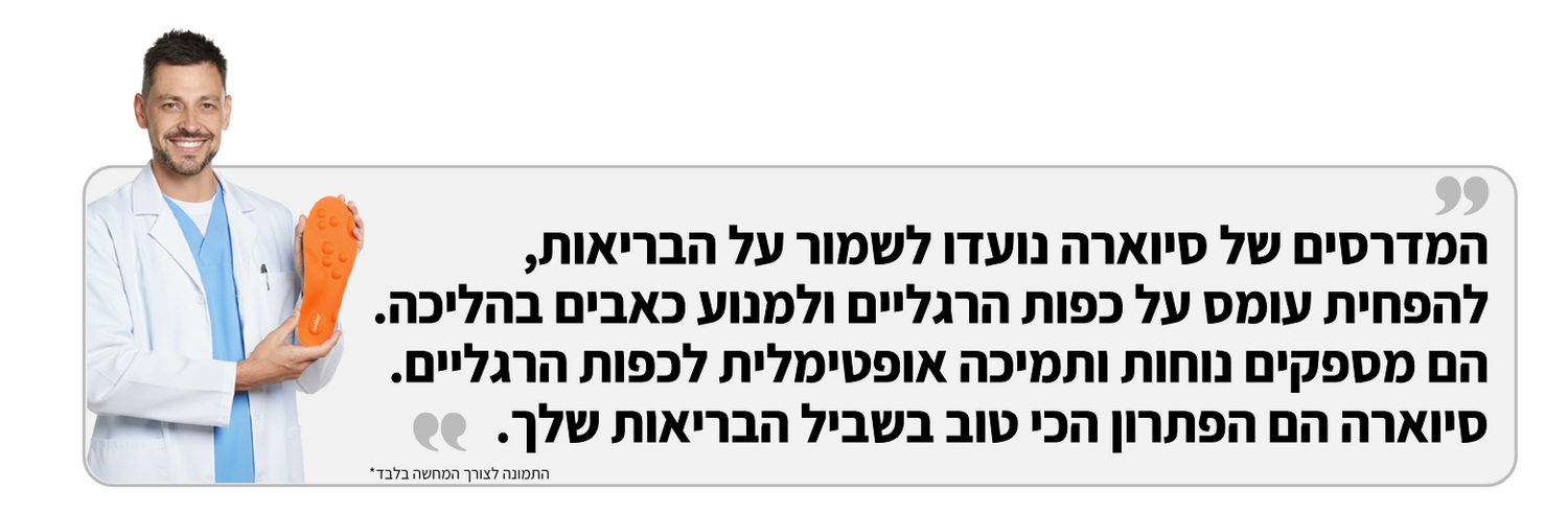 המדרסים של SIVARA הם המקוריים והיחידים שאנחנו עומדים מאחוריהם. קנייה ממקורות אחרים היא על אחריות הלקוח בלבד אנחנו לא יכולים להתחייב שם על איכות, מקוריות או שירות לאחר הקנייה. מדרסים אחרים אולי נראים דומים, אבל לרוב הם שונים באיכות ובמבנה, וזה עלול לפגוע בנוחות ובבריאות הרגליים.